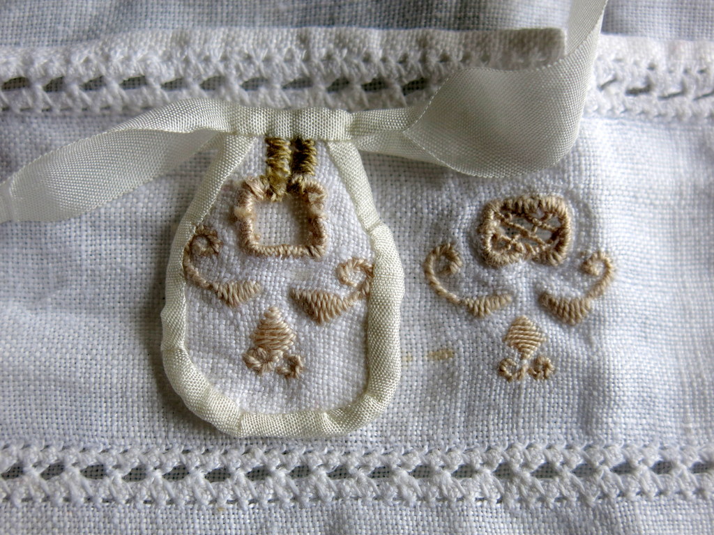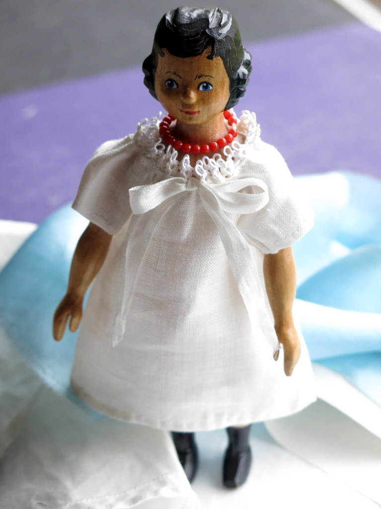 I have been sewing for a doll that is the same size as Rose (6 1/4 inches), using fabrics donated to me by the person who will eventually receive the complete outfit…Rose’s shift is made from a linen hand towel, with a scrap of tatting around the neck, drawn up with a silk ribbon.
