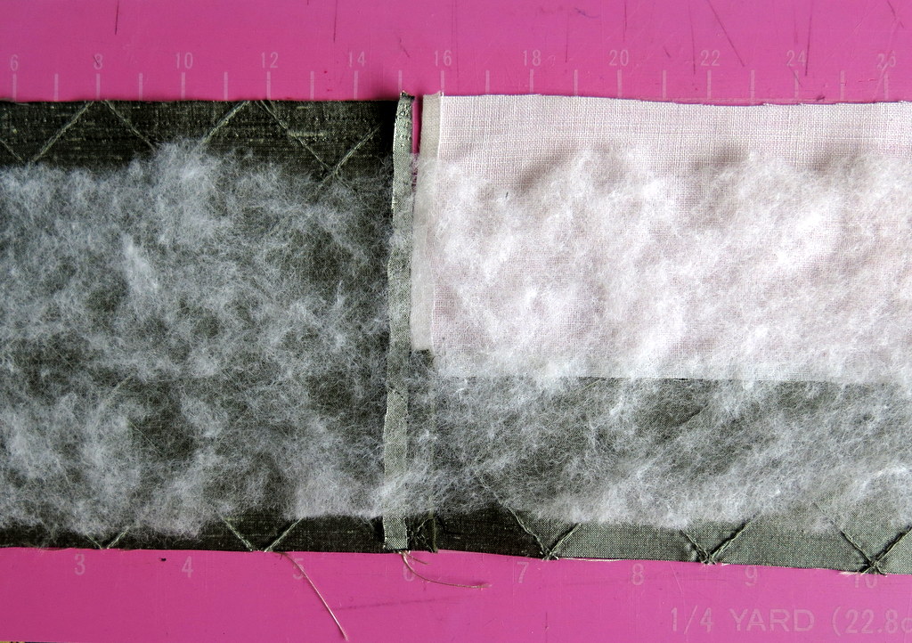 The quilting follows the existing lines of stitching on the grey silk scrap, with some additional stitching.