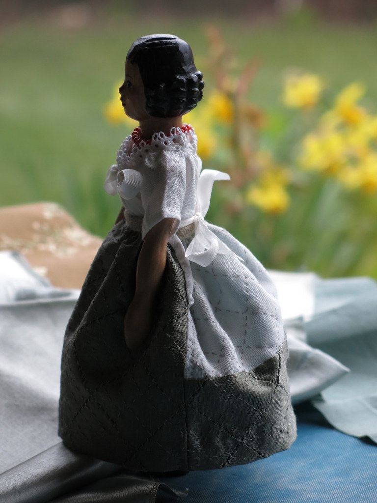 …I had a nice scrap of grey silk for the petticoat, but as it was not quite big enough, I made the back of the petticoat in linen.  This technique was used in some human-sized 18th century petticoats. The padding should have been wool, but alas I loaned my bag of roving to a friend who is experimenting with needle felting, so I used polyester from a bit of an ancient duvet (I bought the double bed size duvet in England in 1987, and recently cut a side off to make it a single bed size).