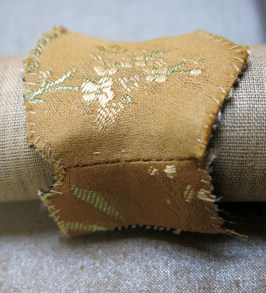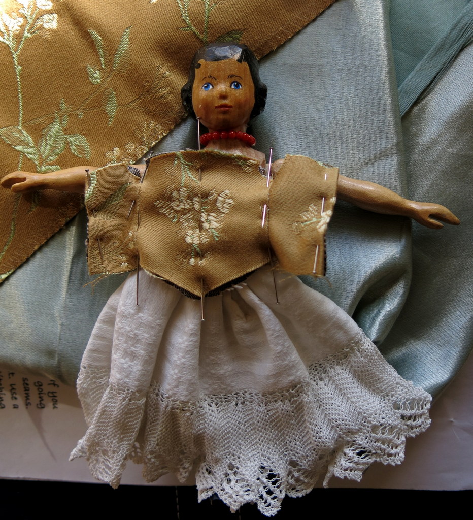 • Dear Mamie is so patient, and we are doing the best we can to make her a beautiful outfit entirely composed of linen, pieces of silk and brocade, and scraps of lace that you sent us! A lace handkerchief with the label “do your magic upon this” is the cause of all this fun, so we thank you!