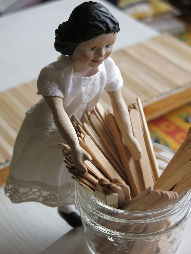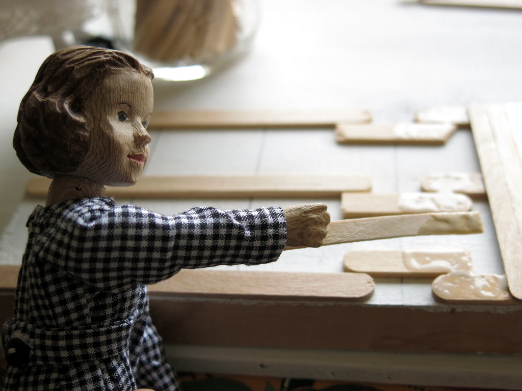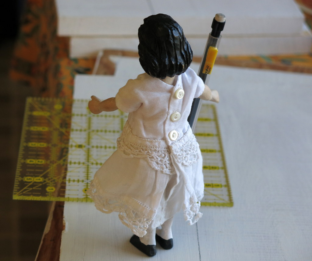 Construction on the Hitty’s bathroom continues – the room box was taken apart into flat pieces, then Vanilla helped to mark straight lines on the walls…