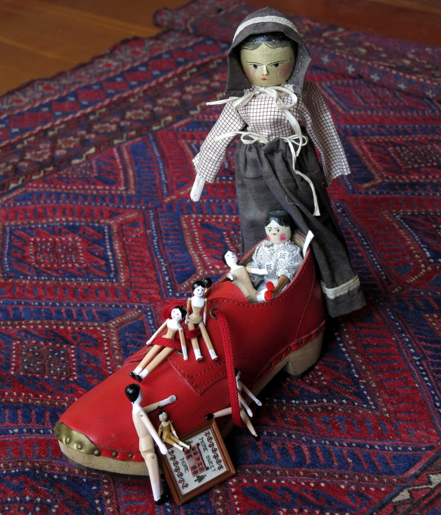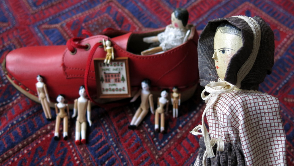 Despite the sour look on the old woman’s face, she is surrounded by a happy abundance of smiles and as you stated, “fun”. Also, what doll wouldn’t love living in that fancy red shoe?