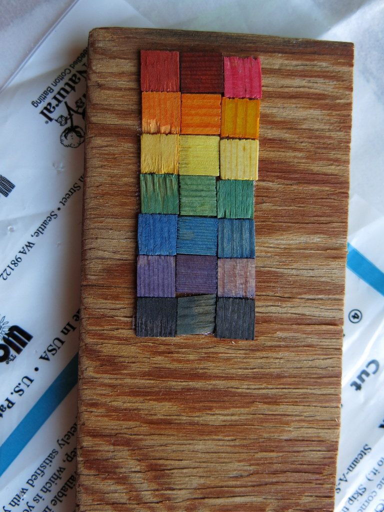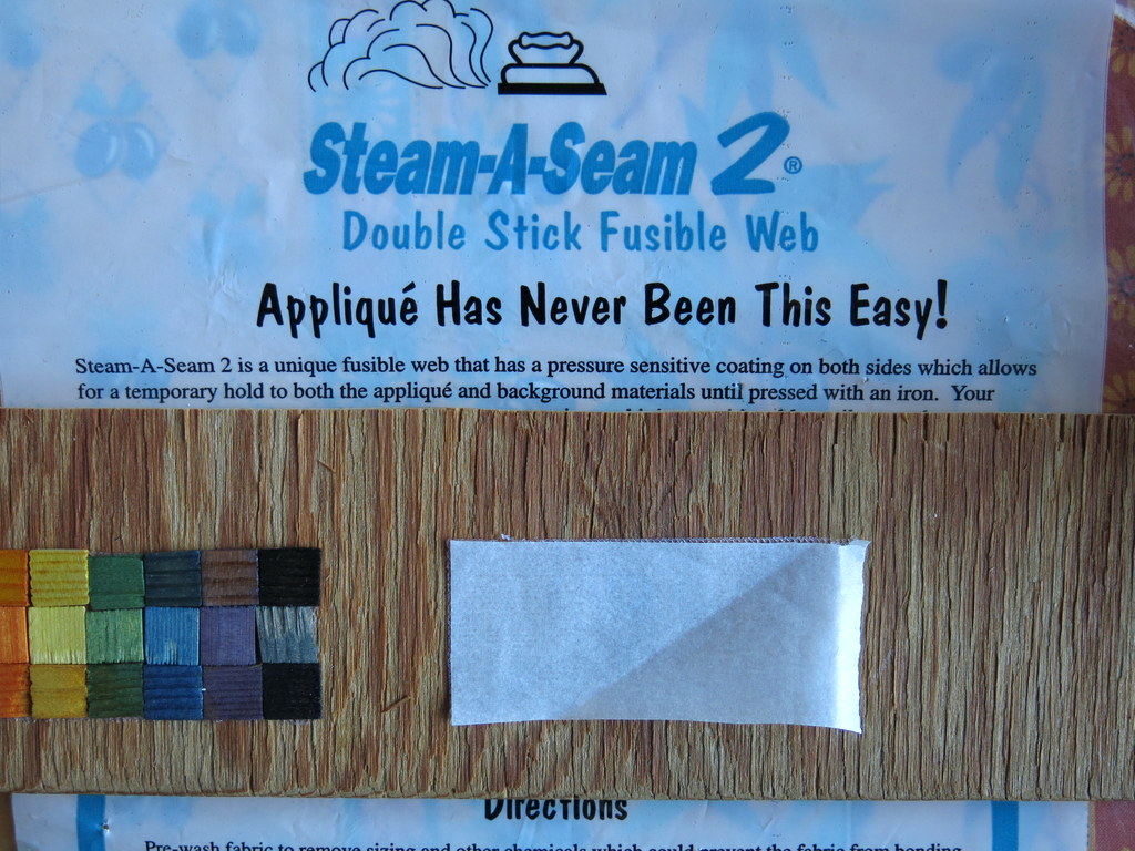 In my stash I discovered some some scraps of fusible web stuff intended for fabric appliqué. I must have bought it a zillion years ago, and do not remember what project it was for…but I wondered whether I could make the idea work for the little wooden tiles. It worked for the veneer, so…