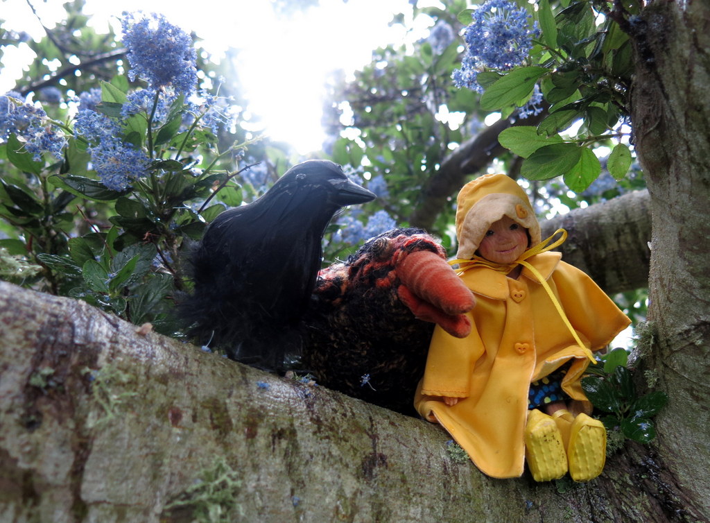 Despite the damp day she looks very happy in her cheerful yellow raincoat and hat which are of course perfect for enabling her to go exploring in the garden and to meet up with two feathered friends. Just charming 🙂