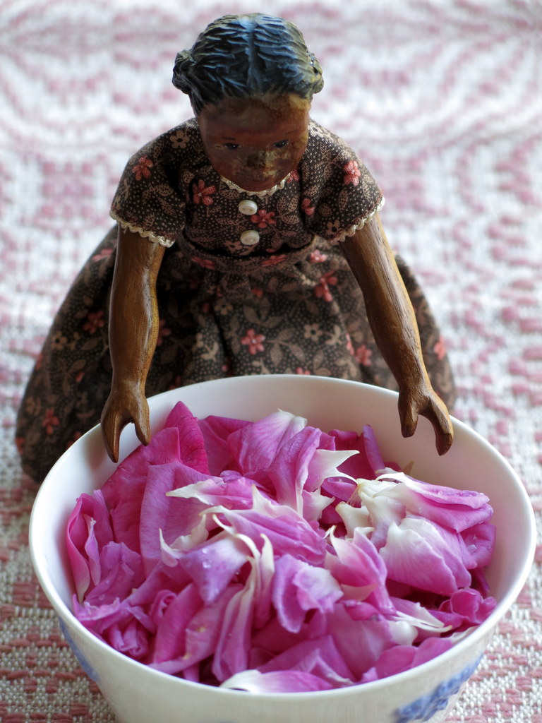 Tuesday does like that dress a lot – a kind Hitty friend gave it to me…the fabric is wonderful. We are lucky with the roses. Our white one is entwined with a pot of mint…I always think I will disentangle them, but they seem happy together in the pot…