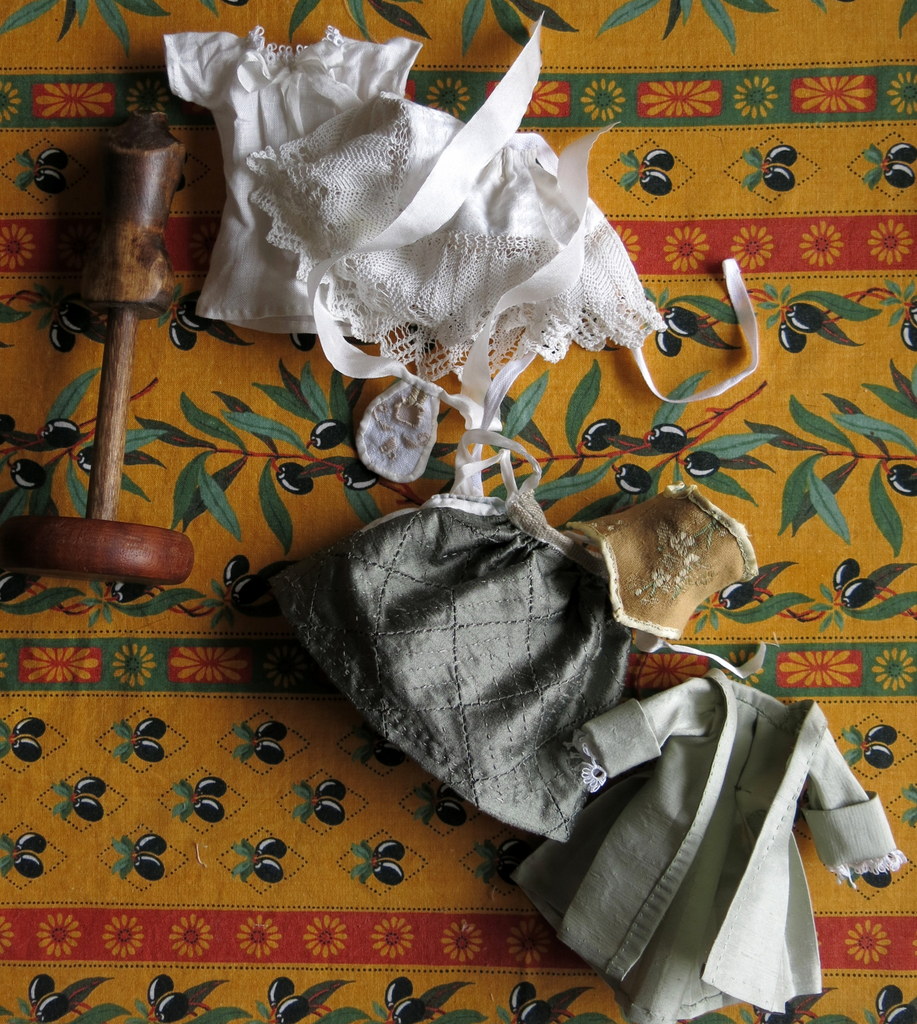 Ensemble: these are the pieces of clothing made to fit my friend’s doll, including: Chemise; Under Petticoat; pocket; Quilted Petticoat; Corset; and Robe.