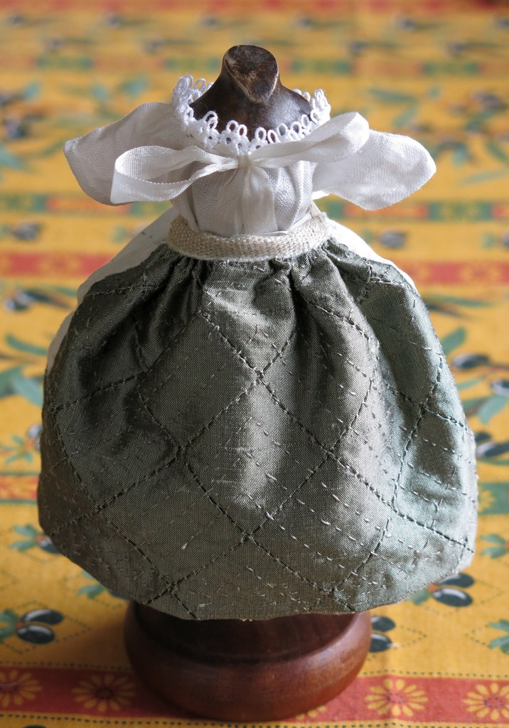 Quilted Petticoat: This is an outer garment…it is made from two panels of cloth, joined at the sides, but leaving an opening so the lady could have access to her pocket! This petticoat is made of heavy weight silk which was expensive, so it is only used on the front panel and at the back hem! The rest is linen, except for the lining which is a light weight silk lining.