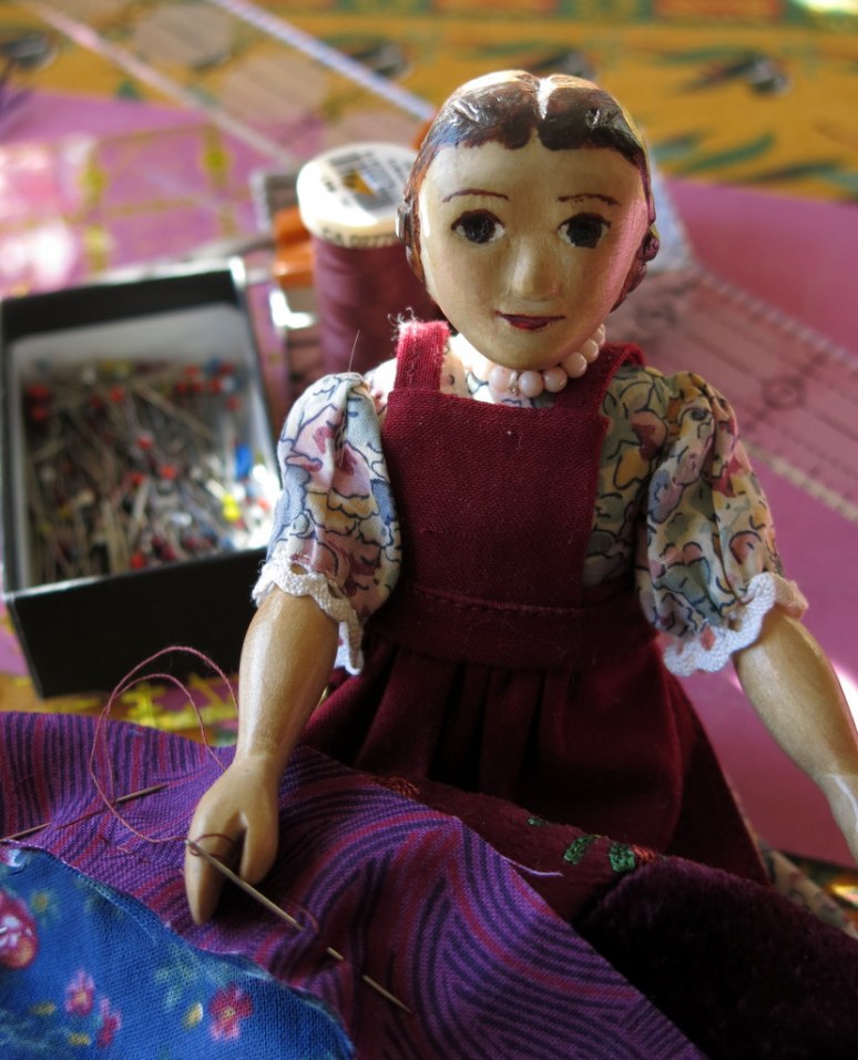 A doll quilt this small doesn’t usually get any batting, or it gets too thick and puffy. I did find some backing fabric that I thought would work, and pinned and trimmed it to shape. Then the binding was stitched to the edge of the quilt top with a running stitch…