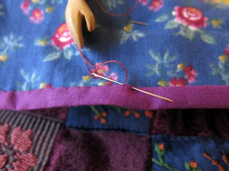 …then folded over to the back and slip stitched into place (I liked the plain purple better than the print side so it is applied “upside down”.