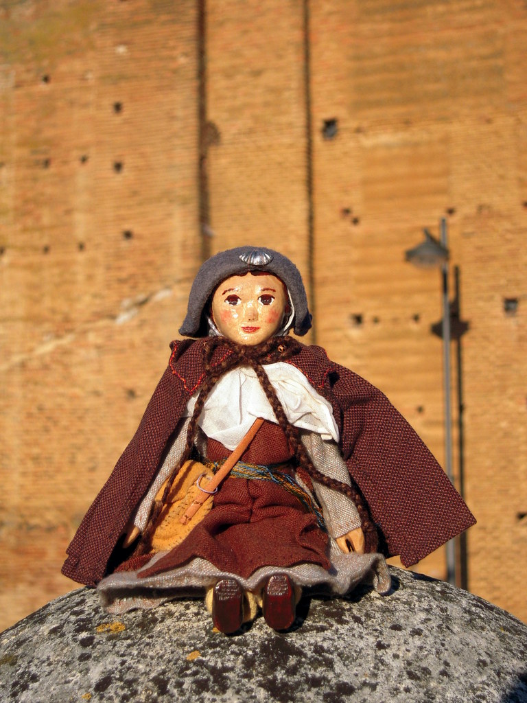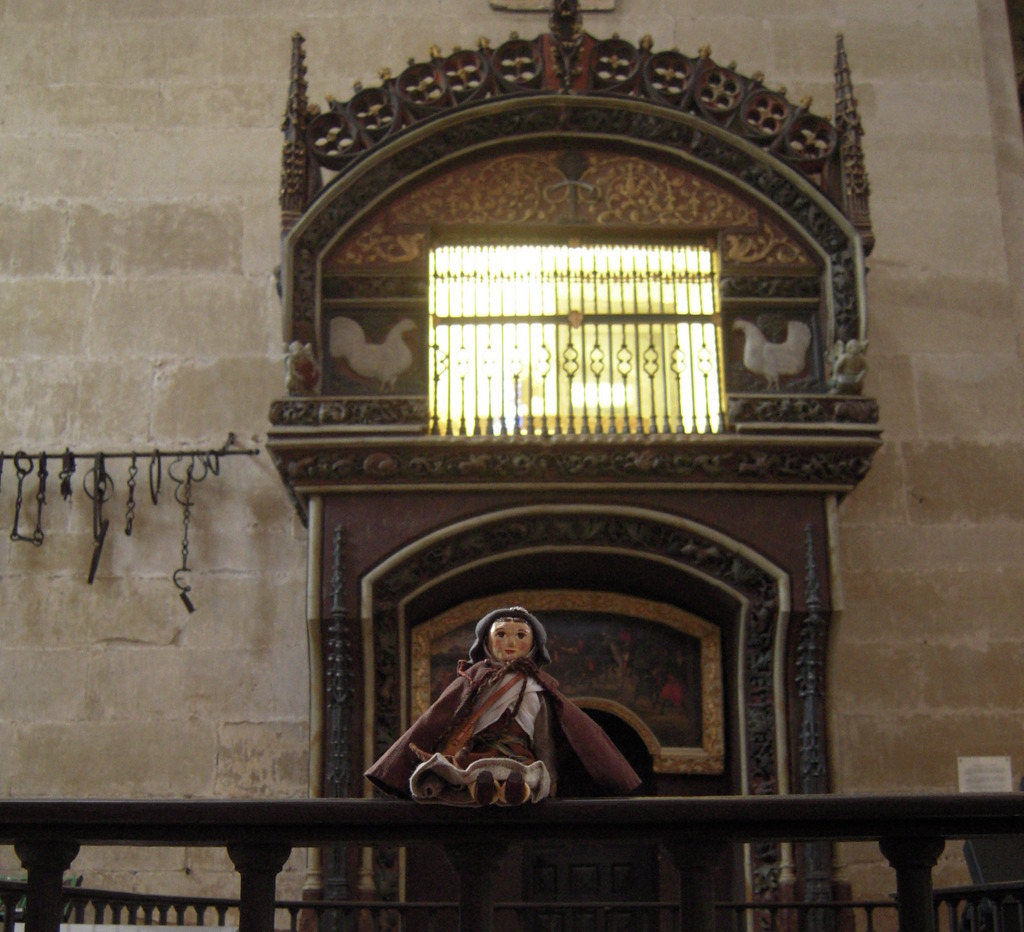 …but Hitty Constance thought the best thing about the town was the Chicken Cathedral (built to commemorate a miracle involving roasted chickens coming alive and proving the innocence of a falsely accused pilgrim). The Cathedral houses a pair of live chickens in the lighted cage above Constance’s head!