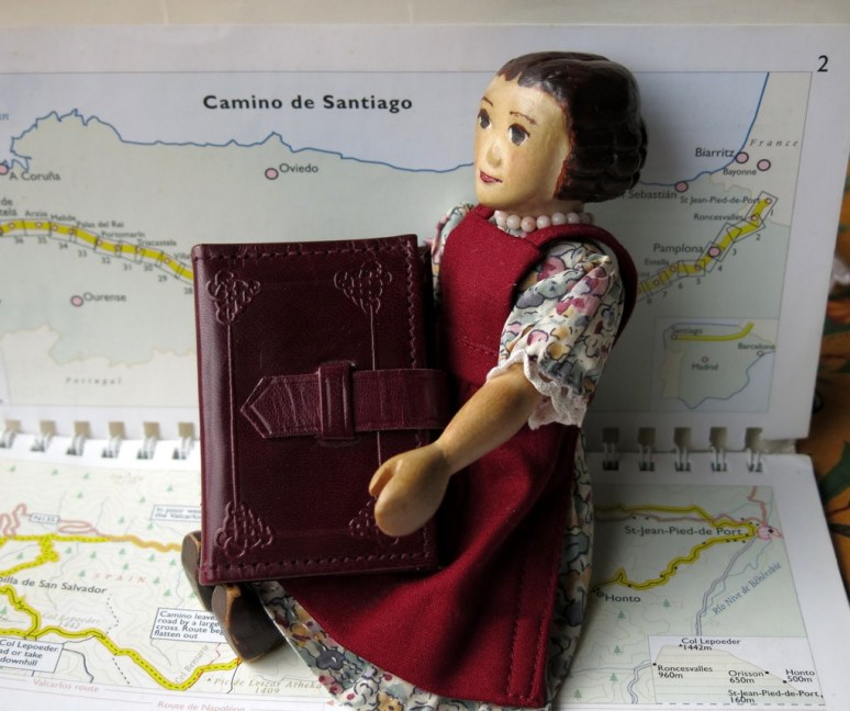 We walked the Camino de Santiago ten years ago, but Constance has a few recuerdos as well as memories…here she is sitting on the very hanky that she shared my pocket with, and surrounded by other mementos…