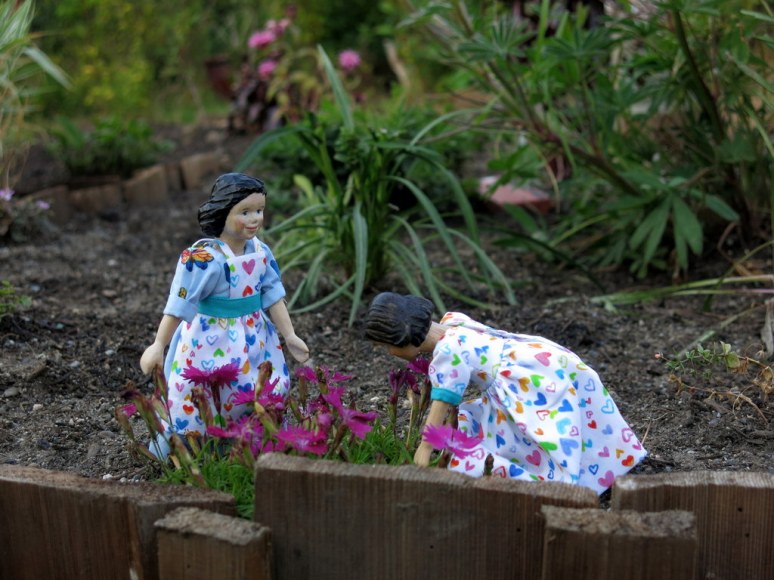 Oh what a wonderful garden to look forward to next year! A lot of hard work to create that space! The girls look so bright and cheerful…that heart print is really sweet! The Country Hittys love pinafores and are very admiring.