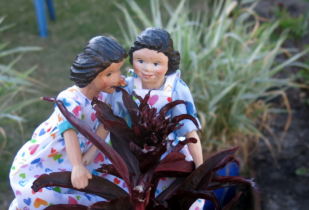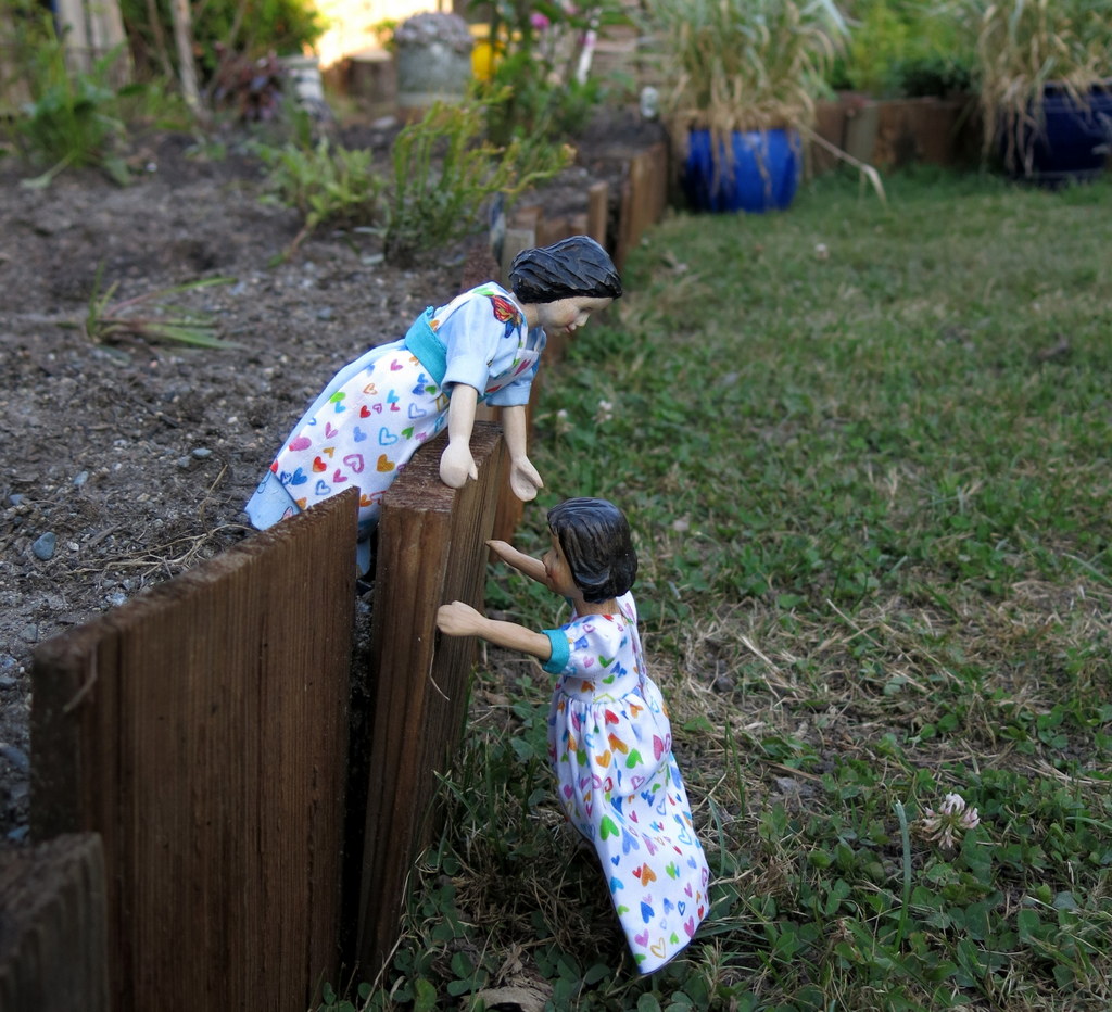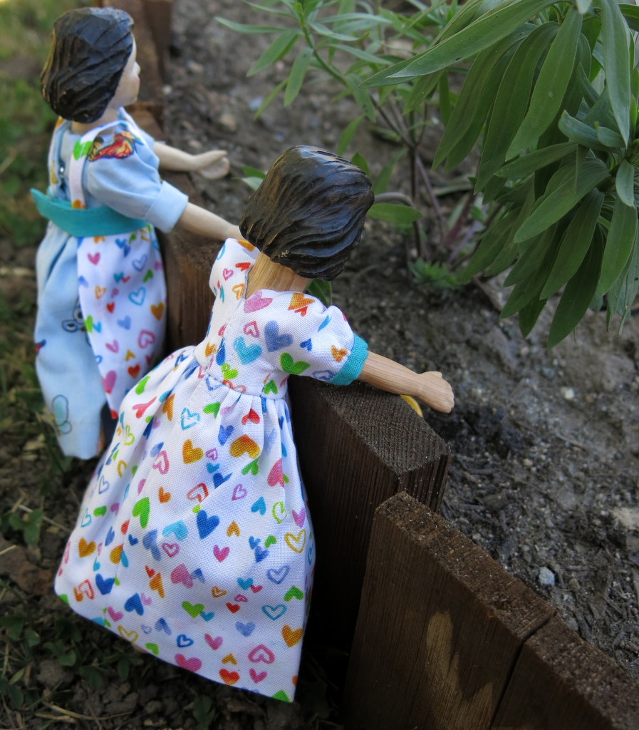 Oh what a wonderful garden to look forward to next year! A lot of hard work to create that space! The girls look so bright and cheerful…that heart print is really sweet! The Country Hittys love pinafores and are very admiring.