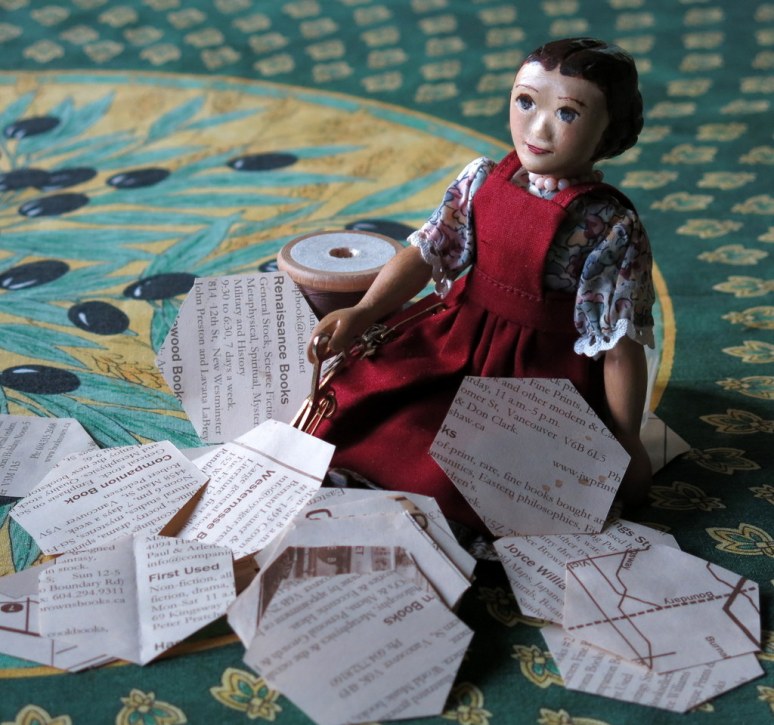 Constance helped to cut a pamphlet about used and antiquarian bookstores in Vancouver – it made many lovely Hexagons…