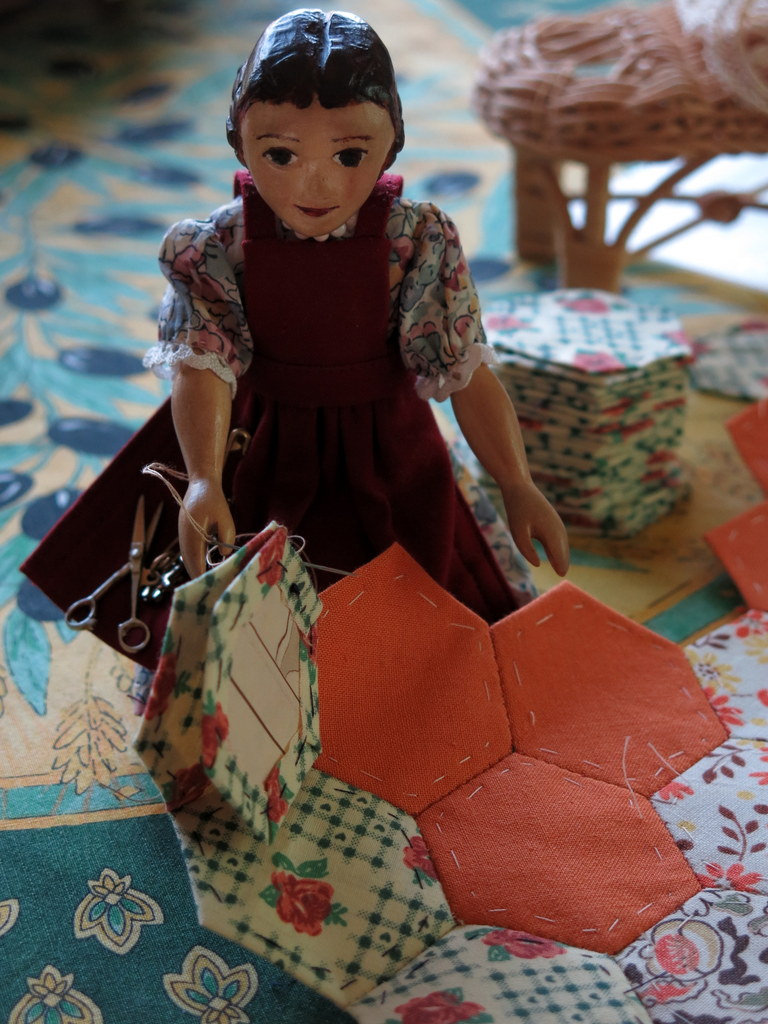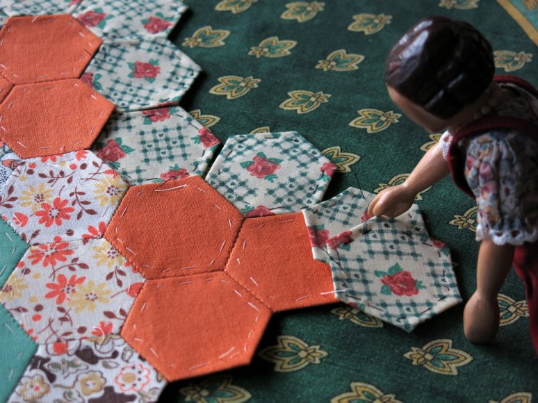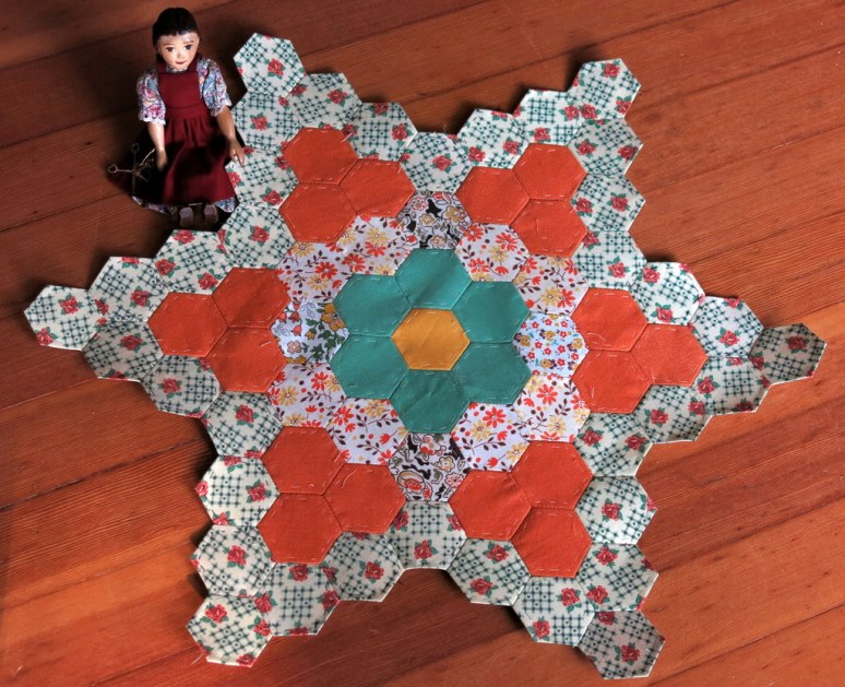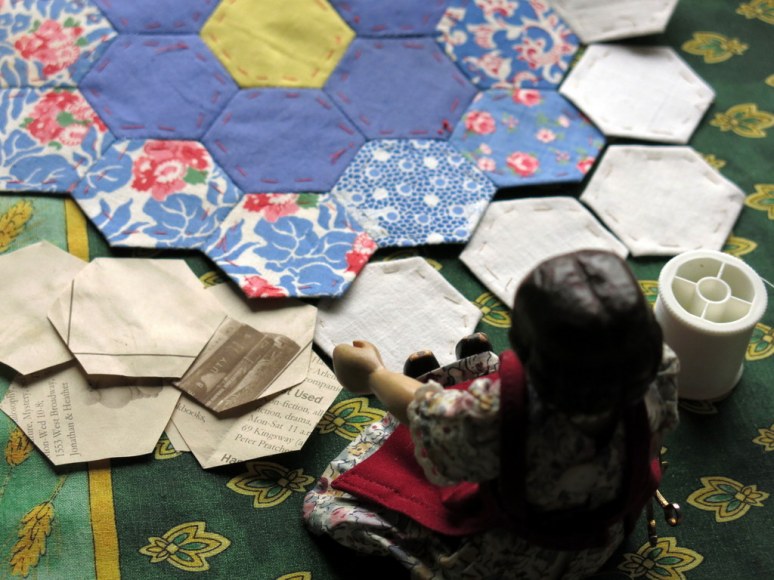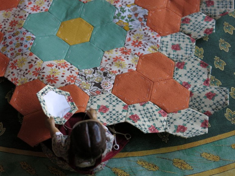 Thanks so much! I love having Constance nearby when I am working on projects large and small…she is very non-judgemental, and also frequently reminds me to stop for tea! I had never sewn a hexagon either until I started this project…though I have done paper-pieces in diamond form, so I knew the theory!