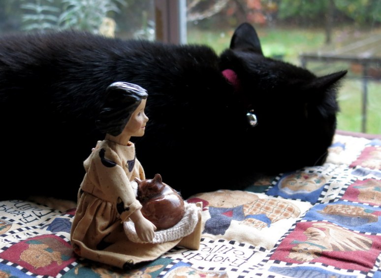 The human kitty lets us know when she wants a lap, sometimes by sitting on the book I am trying to read, lying on my quilt project, or stalking across the keyboard…she will help herself to a lap if she wants one, and will be quite vexed if the lap isn’t properly arranged…the Hittys are very glad that their cats are more obliging and grateful!