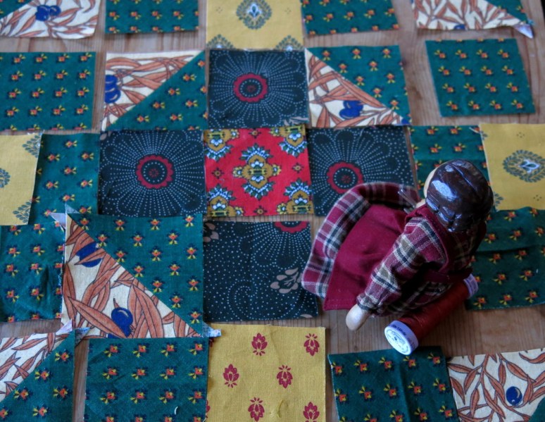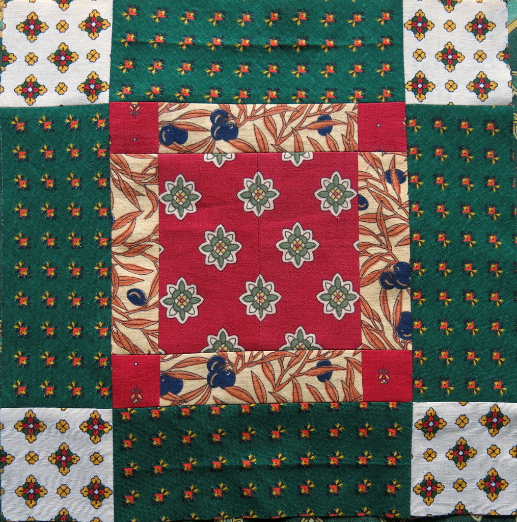 There is one fabric you’re using which I believe is just like the print and coloring that my mother had on one of her dresses in the 1960s. Later, when she discarded it, I made an outfit for myself with it or at least started one as I was on a “kick” to remake clothes into other outfits. The fabric is the white one on the corners of your September block. Since most of my ancestors were from the nearby region of the origin of your fabrics, well, I’m not surprised that it would have tickled my mother’s fancy.