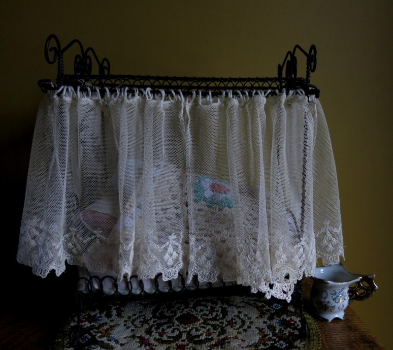 The bed was a wonderful addition to the Hitty Cupboard, and it was fun fixing it up with the bedding and drapes – it was made by a man from the Czech republic! The coverlet was a perfect addition to the finery!