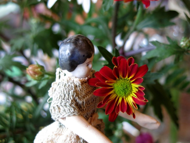 …Mudlark admiring the Chrysanthemum. It is the one we rescued after the deer broke it off the plant last week…