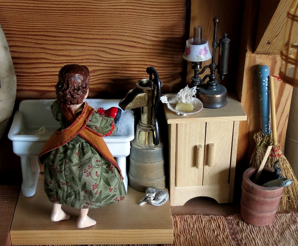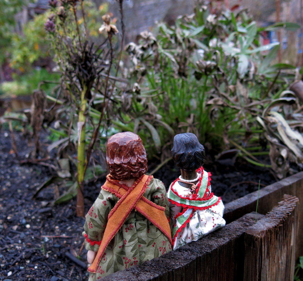 • We were reminded last time they ventured out into the garden, that a holland apron might help keep the slime off of their pretty new dresses! The weather has been stormy, but they were glad to take advantage of a short dry-ish spell to get a bit more garden tidying accomplished!