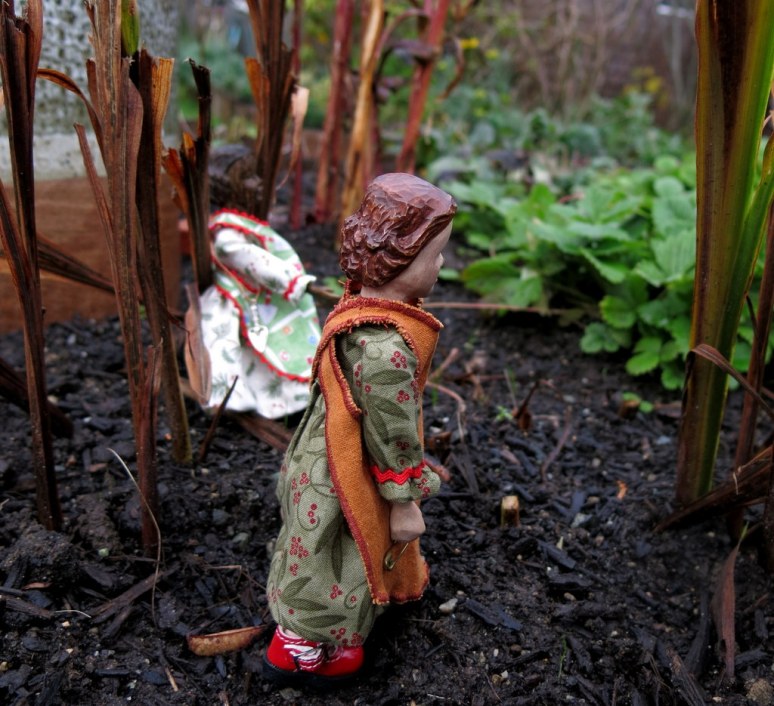 We were reminded last time they ventured out into the garden, that a holland apron might help keep the slime off of their pretty new dresses! The weather has been stormy, but they were glad to take advantage of a short dry-ish spell to get a bit more garden tidying accomplished!