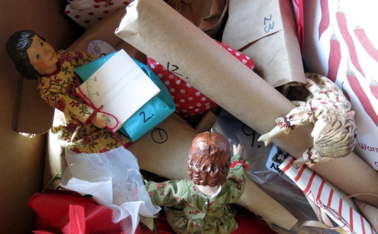 We have a Christmas Angel who organised 24 crafty friends in September – each of us were to make 24 little gifts, and when they were all redistributed, we each received a big box of small wrapped home-made gifts – each one numbered so that we open one each day of December until the 24th.