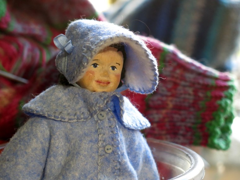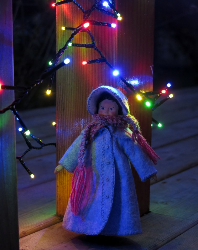 Vanilla looks so warm and ready for Winter. Love the soft blue coat and bonnet. The scarf is beautiful and will keep Vanilla’s neck warm and toasty. The color combination is perfect. She looks so pretty against the soft evening christmas light.