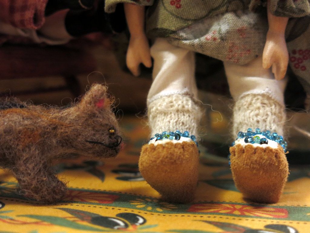 • Floradora is glad to have her socks at last…they are faster to knit than the human-sized ones, but they are much more fiddly! The slippers were made by a First Nations woman in the Yukon…they are indeed very traditional, comfortable and pretty!