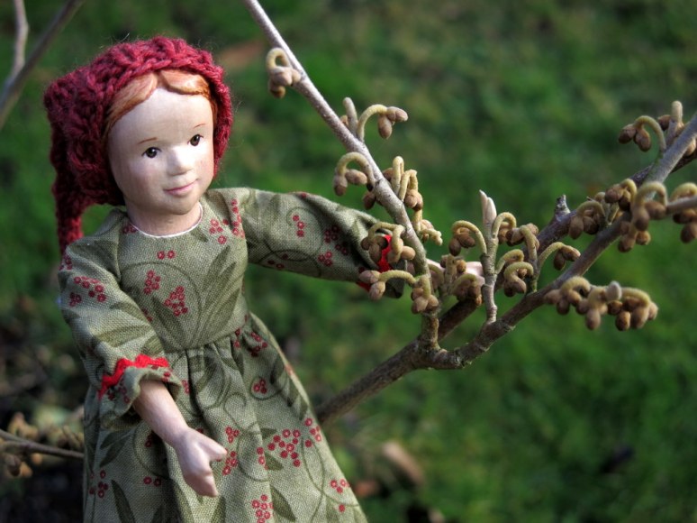 …and Floradora was so intrigued by the little Witch Hazel buds – another early blooming shrub which we planted to cheer our winter garden (not so much needed today, but much appreciated on the usually dark grey, stormy and rainy winter days).
