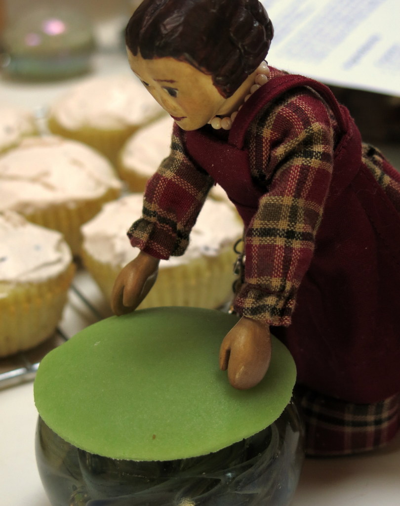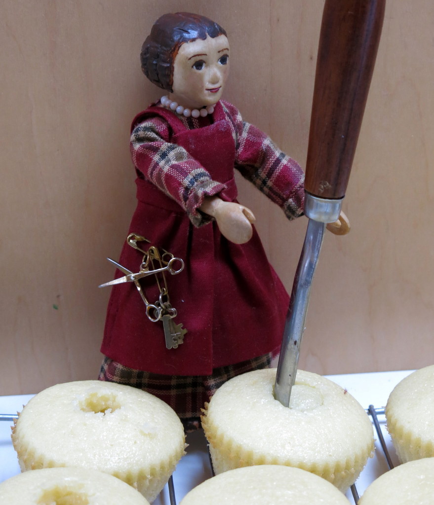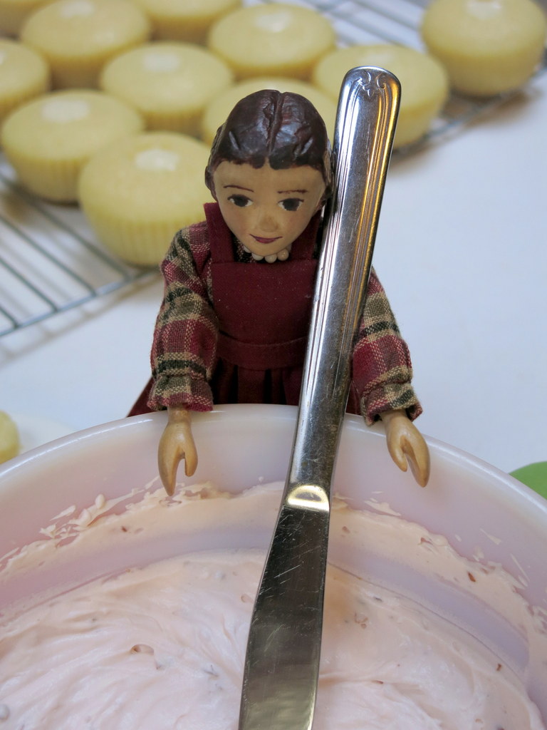 Eight is a delightful age! The tiny cupcakes were fun…after coring holes into the big ones, we had all these tiny Hitty-sized muffin-shapes…it didn’t take much to make mini prinsesstårtas! And Constance was very encouraging!
