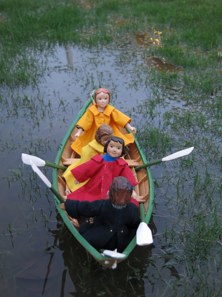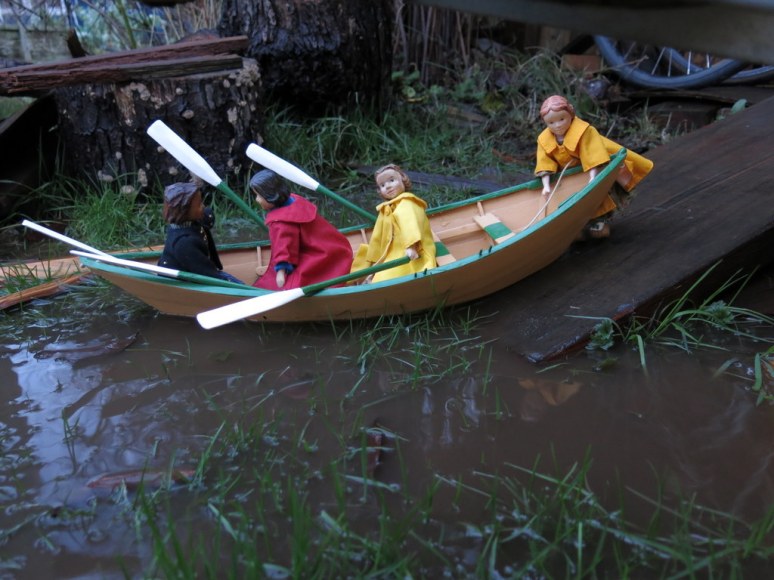 Another fierce storm filled the back yard with water, so Gráinne invited Floradora, Arianell and Tipsy out for a little row in the dory…