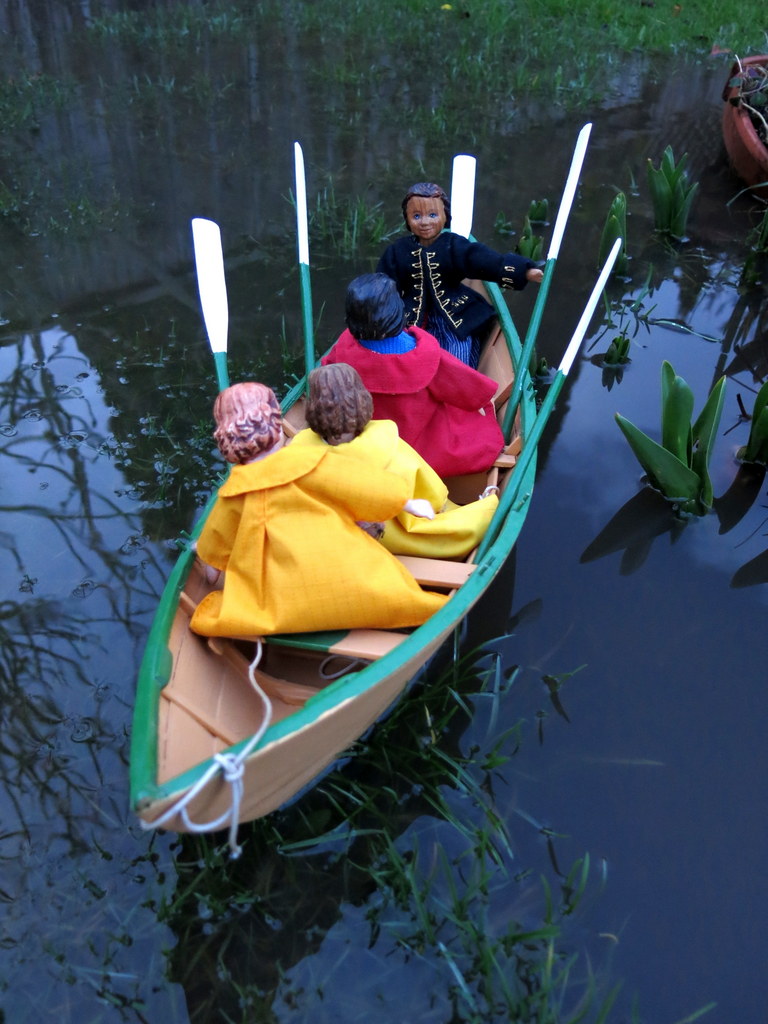 Another fierce storm filled the back yard with water, so Gráinne invited Floradora, Arianell and Tipsy out for a little row in the dory…