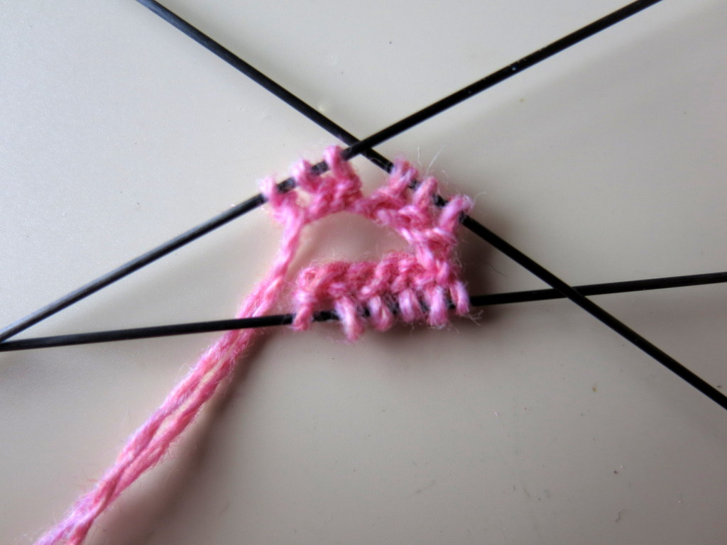 transfer the stitches to three single DPNs with six on the first needle, and three on each of the two others. form a circle so you can knit in rounds