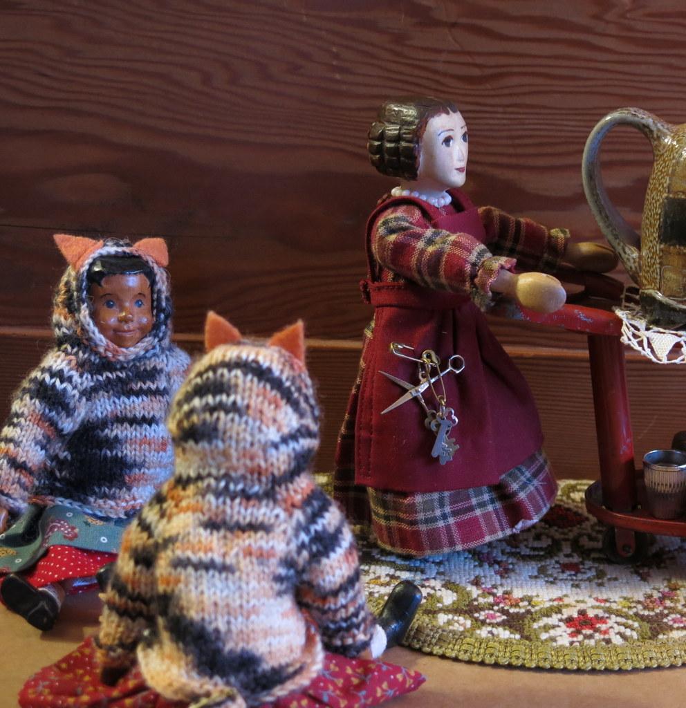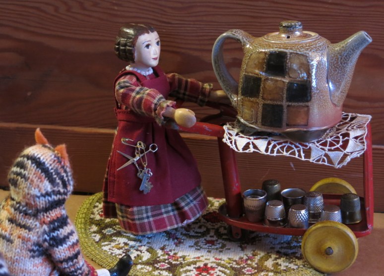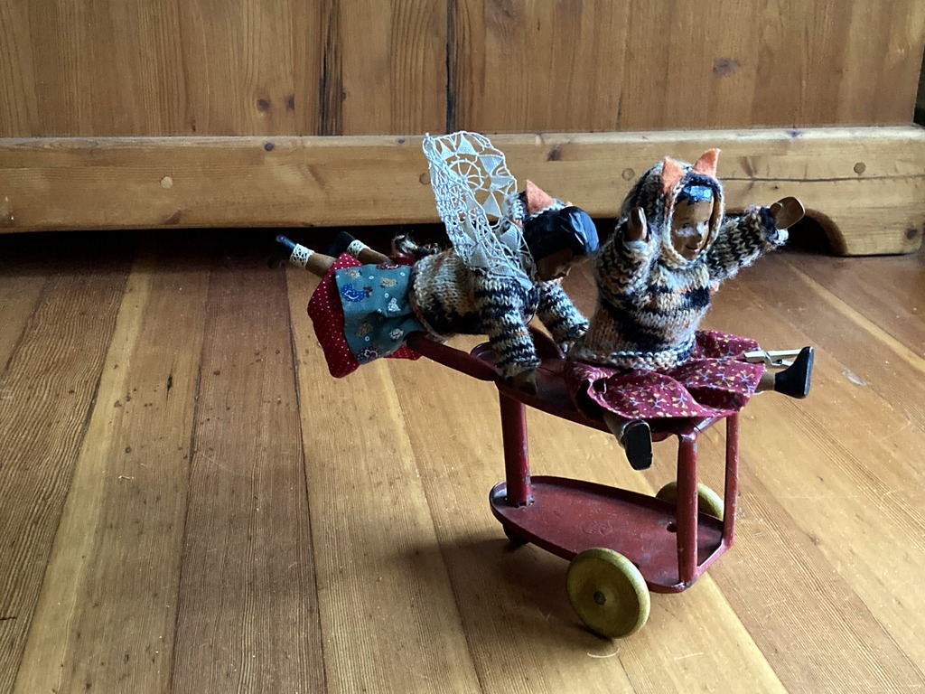 • Opal and Agathe are full of fun and games, and they hardly made a dent in the tea trolley, and didn’t scrape much paint off either. Of course it is already dented and scraped so no-on noticed! I bought that tiny China doll last year, it must have been one of the last times I ever went into a store!