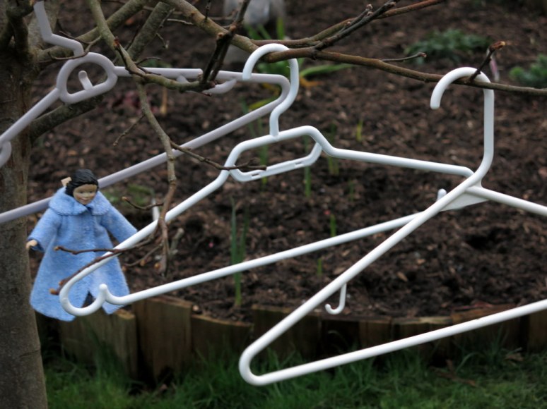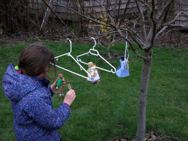 Young human brought three hangers and two clothespins…I supplied the third pin, and the Hittys – the story was entirely her own! I love telling stories with her!
