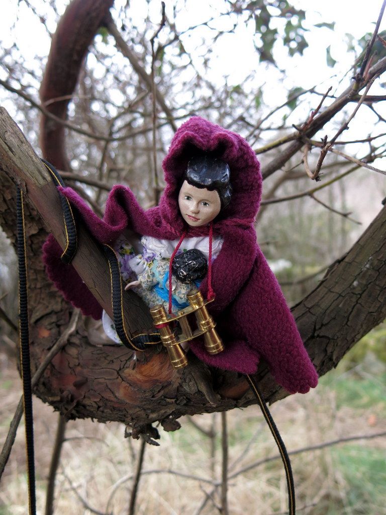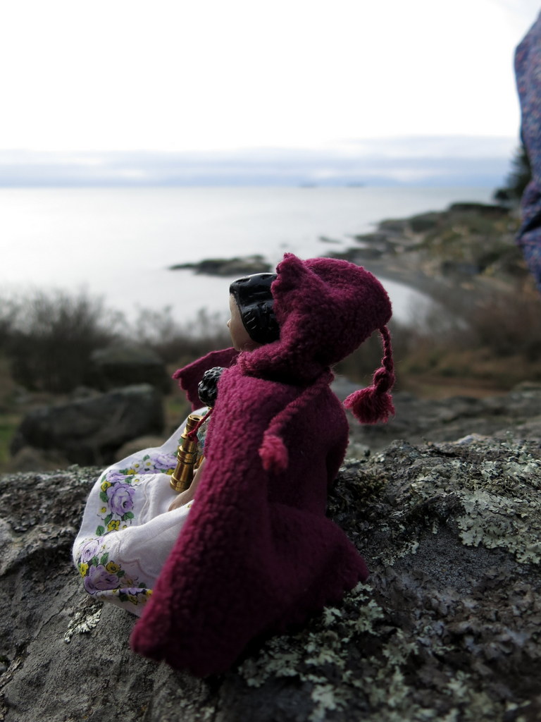Anthea was glad of the warm soft cloak which could cover both her and the baby. She brought her binoculars so she could go birdwatching. They saw an immature seagull swimming and also a male Bufflehead in the water.