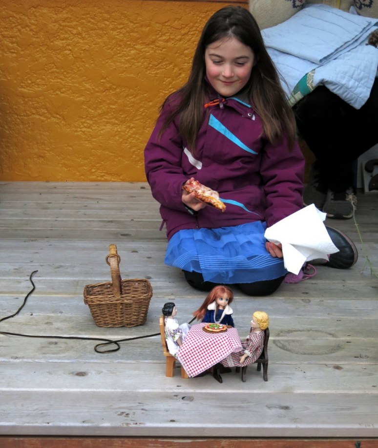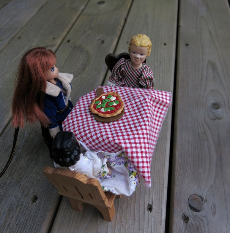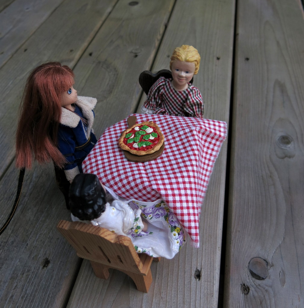 Such a fun way to visit and enjoy some good pizza. The youngest looks quite content with dolls and pizza.