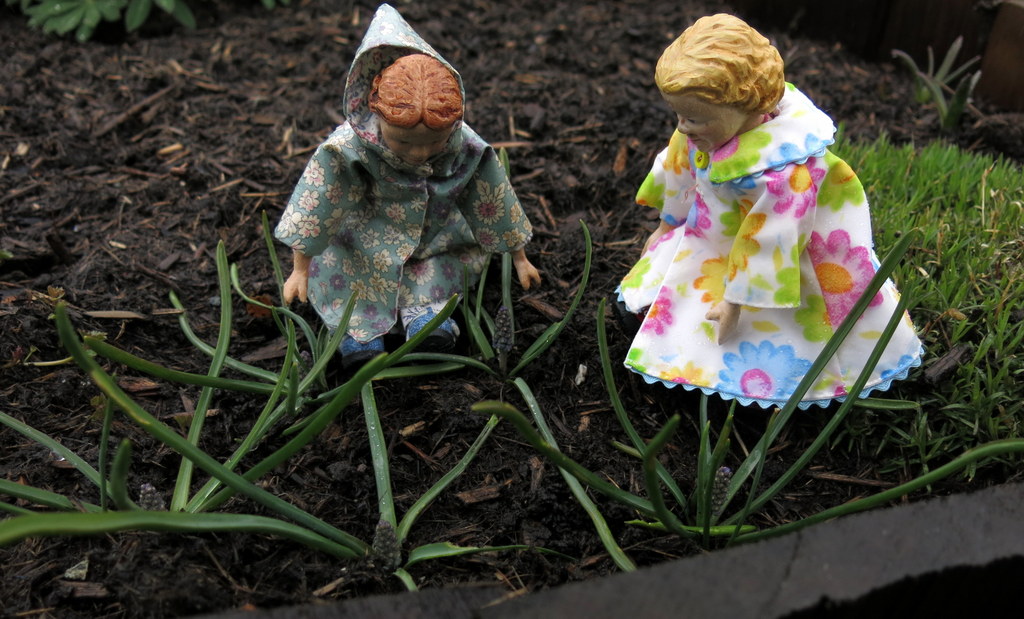 …and spidery little grape hyacinth leaves are protecting the flower cones, just emerging into the showers of rain.