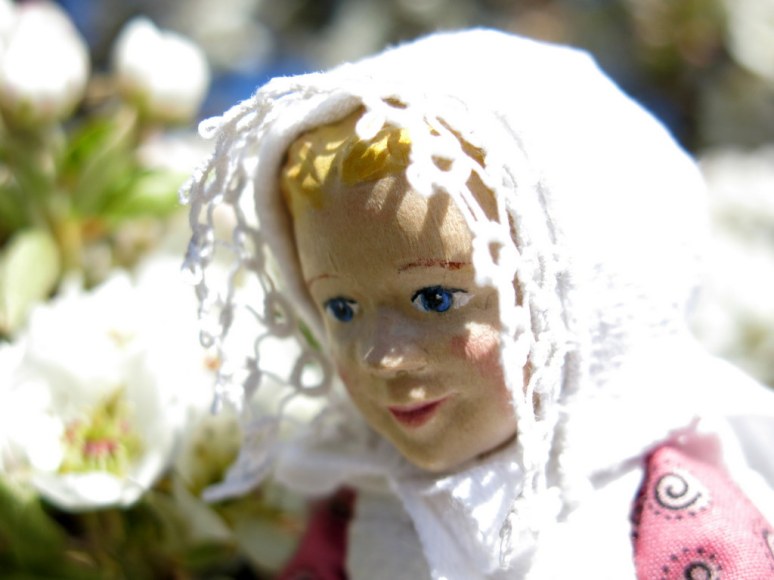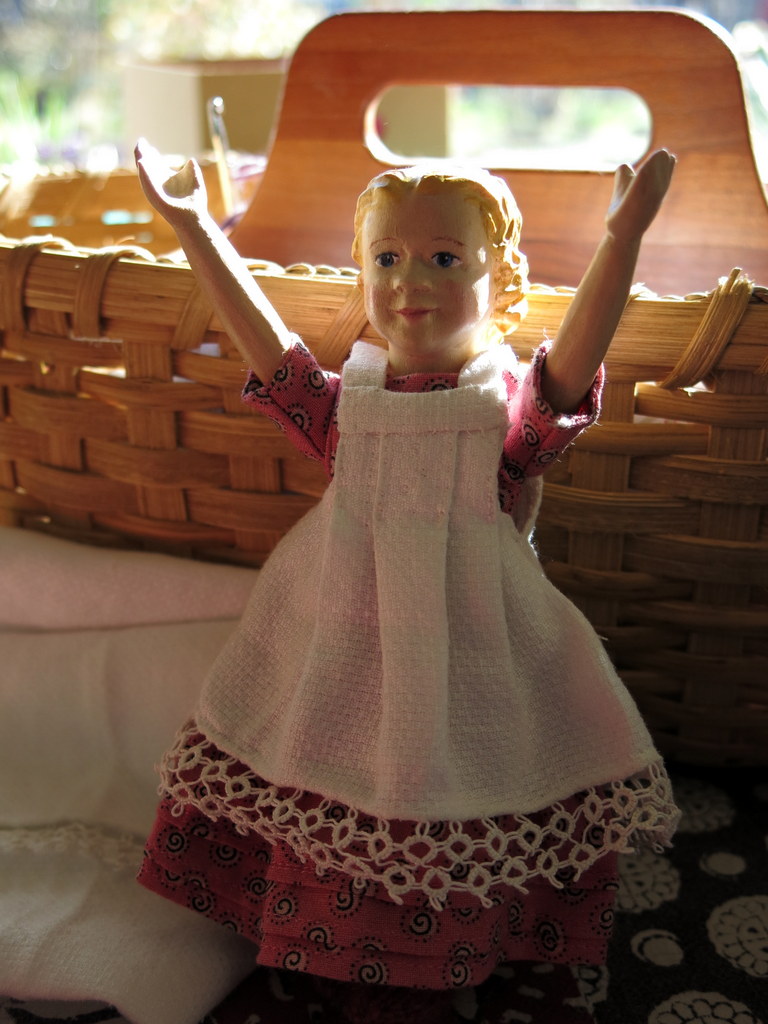 1. What a sensible Hitty Miss Henrietta is, to know she should stay out of the bright sunshine with her colouring. That is a really beautiful bonnet, a perfect use of the last of the fabric and frivolité (a much nicer name than tatting!). She looks so pretty!