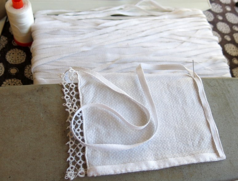 …then cut out a rectangle of cloth…the head measurement is the tatted edge, the long edge is about one and a half times that length.