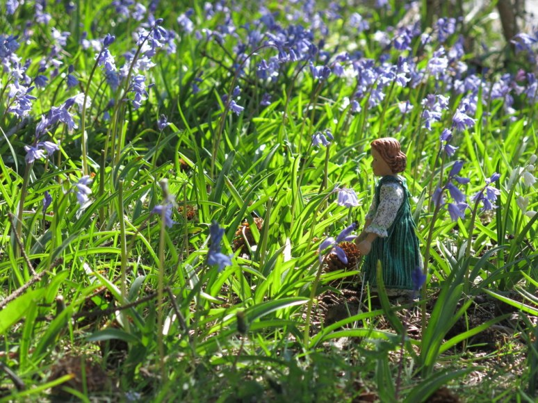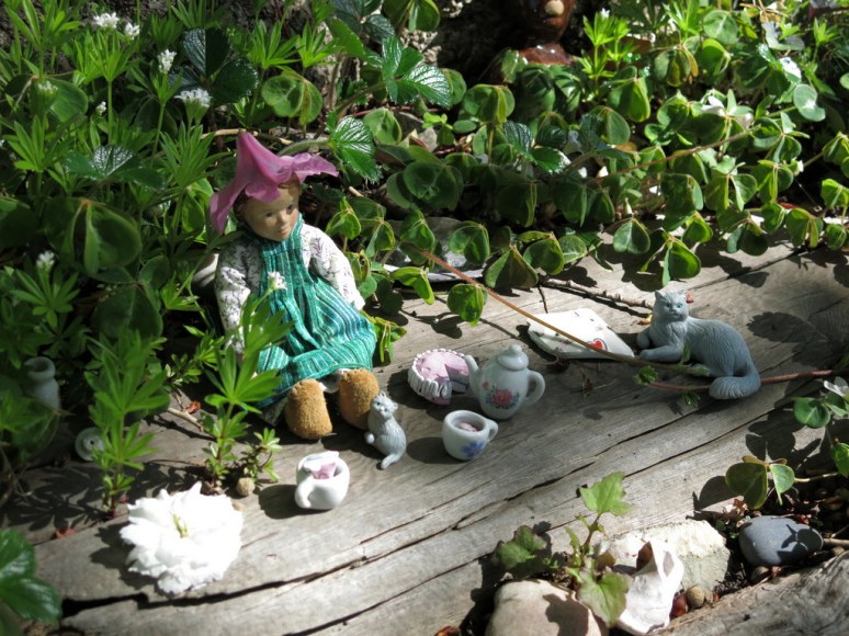 …and arrived at last at her favourite tree, where she stopped for a restorative cup of sweet tea and cakes. These treats are always set out on this log for the relief of tired dolls, complete with friendly and encouraging cats.