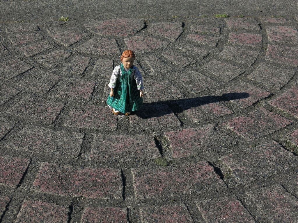 …and arrived at last at her favourite tree, where she stopped for a restorative cup of sweet tea and cakes. These treats are always set out on this log for the relief of tired dolls, complete with friendly and encouraging cats.