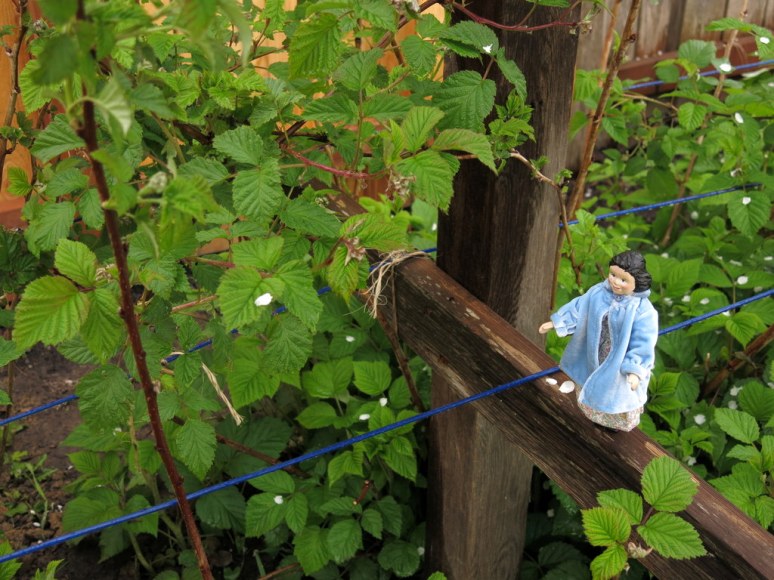 We finally were able to stake up the raspberry canes, which were quite disturbed by the recent fence-building..they are near the pear tree and have a dusting of pear petals. We are excited to see all the raspberry flower buds getting ready to blossom.