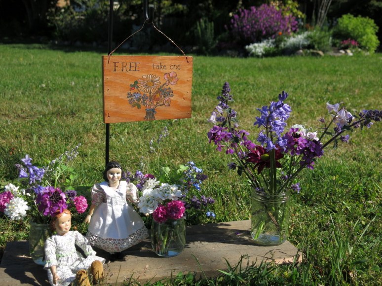 …sometimes I put a few posies out on the boulevard if we have enough to share…a Friday Bouquet for passers-by (Floradora and Vanilla only stayed long enough to help arrange the flowers)!