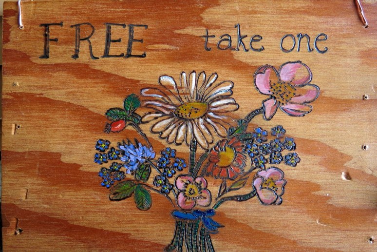 7. How generous to share your blossoms with passer bys. And what a clever use of those slats…Love your signs. Also the postcard from the little wood tiles…genius!!