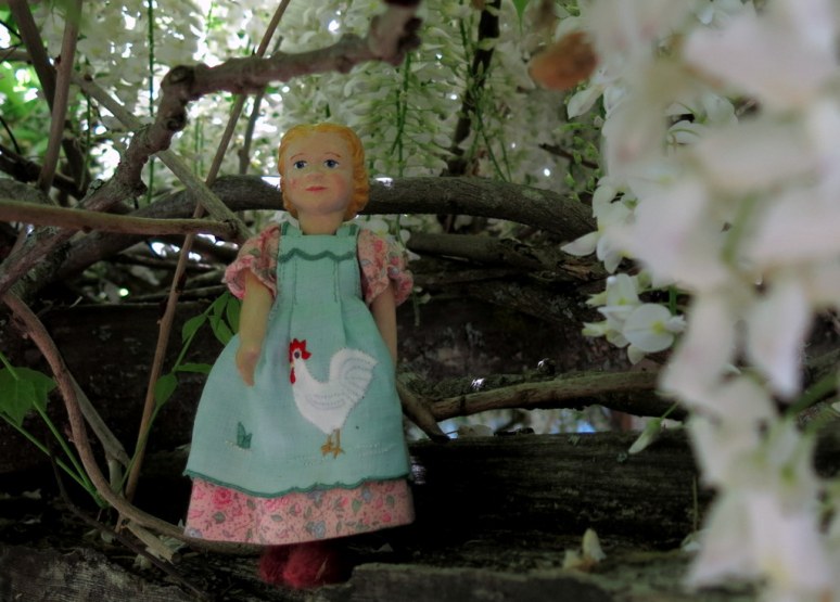 We are always glad to visit this house, especially when the wisteria is in bloom – it is so pretty, and sends that sweet perfume out into the warm afternoon air. I try to bring a Hitty or two with me on these visits, they always try politely to speak “vine” to it but their accent might be off a bit, they are much better at “tree”.