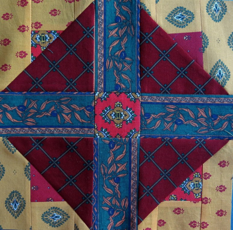• Thank you very much, Constance in particular is a good encourager. she was with me in Aix-en Provence when I bought some of the fabrics, so she has a vested interest!! My husband likes to help position the blocks so will “let” him help too! I will be “sashing”, definitely, though I think of it as mullions between panes… I have some dark green I think will work, and also just retrieved some fabric from Mother-in-law’s stash, which I gave her…may combine with that.