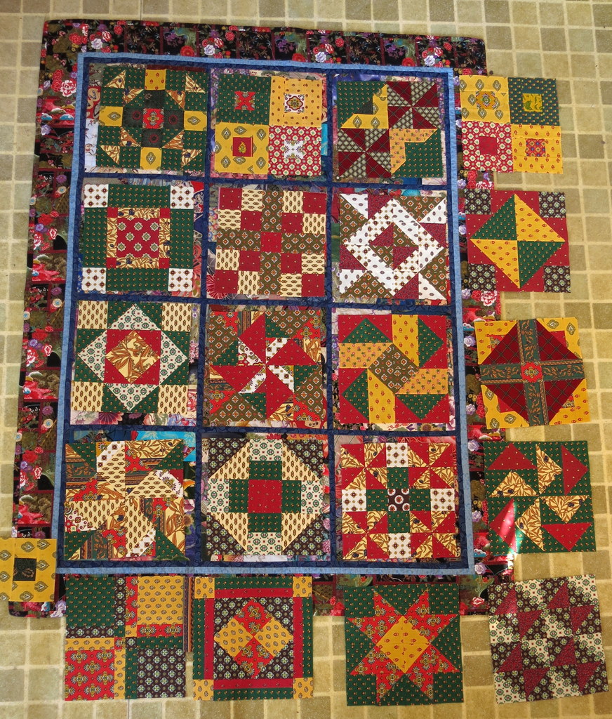 …here they all are – not the final placement.  I lay the blocks on top of a small quilt I already have that was pieced together using mullion strips. I definitely like this version better than the original pattern which calls for alternating the colour blocks with plain fabrics pieced into “hourglass” blocks. The original also makes a double bed size quilt and I wanted a single bed size, so this will work.  Up till now I have managed to avoid buying any new fabric in making this quilt – hooray!