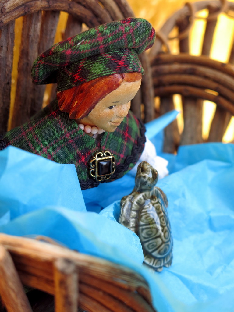 Aurelia has claimed this outfit – made by one of my kind and talented Hitty friends. I didn’t find out that she was the Queen of Scotland until young human came to visit (though it ought to have been obvious from her plaids, jewels, and demeanour)!
