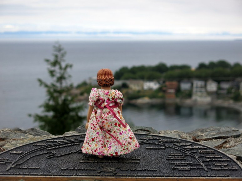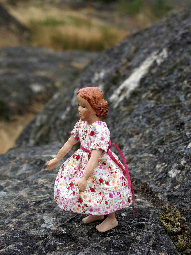 We like to climb the hill behind our house – Floradora likes to do it barefoot, though her non-wooden companion kept shoes and socks on all the way to the top!